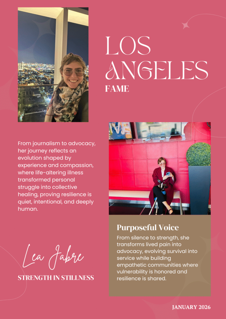 A diagnosis of rare autoimmune diseases marked a turning point in Lea’s life. What followed was not only a physical battle, but an emotional and existential reckoning. As her health challenges intensified, so did her clarity. “I ended up working in the nonprofit sector as a director,” she says, “and eventually created Bent Not Broken, an advocacy page dedicated to my rare disease.”